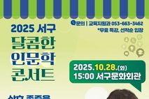 [경기뉴스원/경기뉴스1] | 대구 서구청은 오는 28일 오후 3시, 서구문화회관에서 주민을 대상으로 소통 전문가 박재연 소장을 초청해 ‘상호 존중을 기반으로 한 대화 수업, 연결의 대화’를 주제로 『달콤한 인문학 콘서트』를 개최한다. 박재연 소장은 리플러스 인간연구소 소장으로 재직 중이며, 한국신학대학교 대학원 죽음 교육 상담 전공 교수, 고려대학교 죽음교육연구센터 선임연구원, 교육부 교육정책자문위원회 자문위원 등을 역임했다. 또한 tvN ‘유 퀴즈 온 더 블록’, EBS ‘부모’ 등 여러 방송 프로그램을 통해 진정한 소통과 관계 회복의 메시지를 전하며 대중의 큰 공감을 얻고 있는 소통 전문가다. 이번 행사는 사전 신청 없이 당일 선착순으로, 무료로 입장할 수 있으며, 자세한 사항은 서구청 교육지원과로 문의하면 된다. 류한국 서구청장은 “앞으로도 서구 주민의 삶과 밀접한 주제의 명사를 초청하여 공감과 소통의 장을 마련하겠다.”라며 “주민 모두가 서로를 이해하고 존중하는 건강한 공동체로 성장하고, 지식과 지혜를 함께 나누는 평생학습 문화를 확산시킬 수 있도록 최선을 다하겠다.”라고 밝혔다.