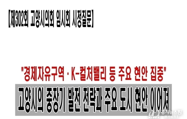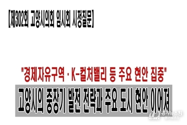 【고양=경기뉴스원/경기뉴스1】 제302회 고양시의회 임시회 시정질문에서 고양시 주요 현안을 둘러싼 질의가 이어지며 경제자유구역 지정 추진, K-컬처밸리 아레나 협약 지연, 창릉신도시 교통대책, 백석1동 행정복지센터 신축 지연 등이 핵심 쟁점으로 부각됐다. 먼저 고양시가 추진 중인 경제자유구역 지정과 관련해 면적 축소와 지정 지연 문제가 도마에 올랐다. 시는 당초 약 807만 평 규모의 후보지를 검토했으나 현재 약 293만 평 규모로 계획을 조정한 상태다. 시는 정밀의료, 스마트 모빌리티, K-컬처 산업 등을 전략 산업으로 설정하고 올해 상반기 지정을 목표로 절차를 추진 중이라고 설명했다. K-컬처밸리 아레나 사업도 주요 현안으로 언급됐다. 사업 협약이 연기되면서 사업 추진 지연에 대한 우려가 제기된 가운데, 시는 경기도 및 경기주택도시공사와 실무협의를 진행하고 있으며 사업 추진 상황에 대한 정보 공유와 협력 강화를 지속적으로 요청하고 있다고 밝혔다. 시는 아레나 공사 현장 방문 등을 통해 협약 체결이 조속히 이뤄질 수 있도록 노력하고 있다고 덧붙였다. 창릉신도시 교통 문제도 시정질문에서 집중적으로 다뤄졌다. 철도 개통 이전까지 발생할 수 있는 교통 공백에 대
