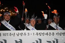 [경기뉴스원/경기뉴스1] | 남양주시는 27일 화도읍 월산교회에서 남양주문화원 주최로 열린 3.1독립만세운동 기념행사가 성황리에 마무리했다고 밝혔다. 이번 행사는 남양주 지역에서 전개된 독립만세운동의 역사적 의미를 되새기고, 지역 독립운동 정신을 계승하기 위해 마련됐다. 행사에는 주광덕 남양주시장을 비롯해 조성대 남양주시의장, 남양주문화원장, 경기북부보훈지청장, 광복회 남양주시지회장, 도·시의원, 독립유공자 후손과 시민 등 300여 명이 참석해 독립 정신을 되새겼다. 행사는 총 3부로 운영됐으며, 1부에서는 기념식과 기념예배가 진행됐다. 시립합창단의 식전공연을 시작으로 기념예배, 주광덕 시장의 경축사와 독립선언서 낭독 등이 이어졌다. 2부에서는 월산교회에서 마석역 광장까지 ‘횃불 대행진’을 진행했다. 풍물패와 군부대의 인도 아래 시민들이 직접 횃불을 들고 행진하며 1919년 당시의 긴박했던 만세 운동 현장을 재현했다. 마지막으로 3부에서는 모든 참석자들이 마석역 광장에서 삼일절 노래 제창과 만세삼창을 외치며 행사의 대미를 장식했다. 주광덕 시장은 “3.1운동의 정신은 과거에 머물지 않고