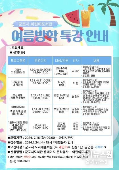 자세한 사항은 군포시도서관 홈페이지를 통해 확인 가능하고, 신청은 선착순 접수로 군포시도서관 홈페이지(문화행사→어린이도서관)에서 7월 16일부터 마감 시까지며, 대상자 발표는 7월 24일 오후 홈페이지 게시 및 개별 문자로 안내될 예정이다.