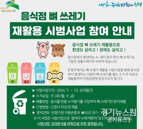 사업에 참여하고자 하는 업소는 은평구청 자원순환과로 전화 문의하면 된다. 은평구는 7월 중순부터 시작되는 이번 시범사업을 통해 매월 약 20톤의 뼈 쓰레기가 재활용돼 일반생활폐기물이 감량될 것으로 기대한다.
