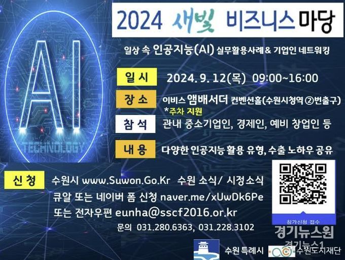 수원시 관계자는 “AI에 관심 있는 기업인, 창업자들에게 실질적으로 도움이 될 수 있는 행사”라며 “같은 분야 전문가들과 교류하며 네트워킹할 수 있는 좋은 기회가 될 것”이라고 말했다.