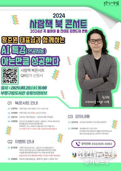 경기뉴스원(경기뉴스1) | 부평구 구립 부개도서관은 미디어 창작공간 ‘나래’에서 오는 28일 온라인 사람책 북콘서트 ‘2024년 꼭 알아야 할 라이프트렌드의 변화 – AI특강(인공지능) 아는만큼 성공한다’를 개최한다.