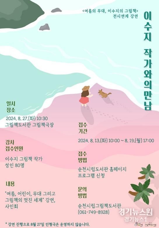 경기뉴스원(경기뉴스1) | 순천시는 오는 27일 오전 10시 30분에 그림책도서관에서 '여름의 무대, 이수지의 그림책' 전시 연계 프로그램으로 “이수지 그림책 작가와의 만남”을 개최한다고 밝혔다.
