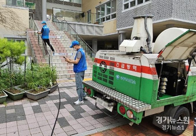 경기뉴스원(경기뉴스1) | 수원시 영통구 광교2동은 지난 7일 영통구 보건소의 협조를 받아 청사 주변 방역을 실시했다.