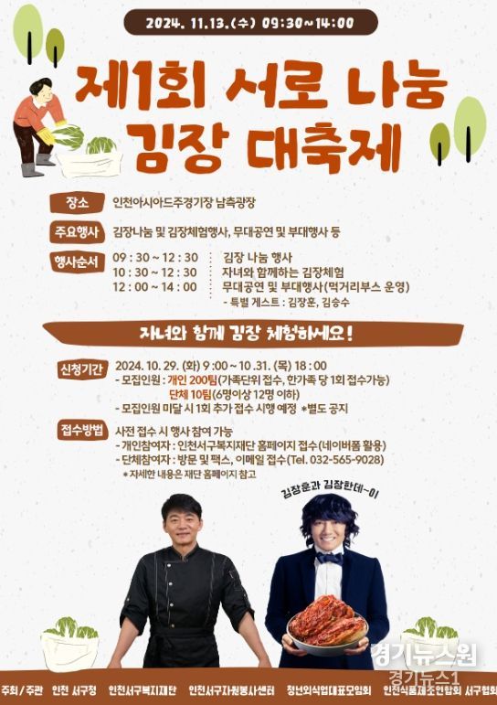 경기뉴스원(경기뉴스1) | 인천 서구가 다음달 13일 인천아시아드주경기장 남측광장에서 제1회 서로 나눔 김장 대축제를 개최한다.