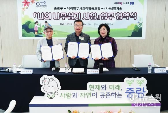 경기뉴스원(경기뉴스1) | 중랑구가 지난 5일 낙이망우사회적협동조합과 (사)생명의숲과 함께 망우역사문화공원에서 진행될 ‘나의 나무심기 사업’ 업무협약을 체결했다.