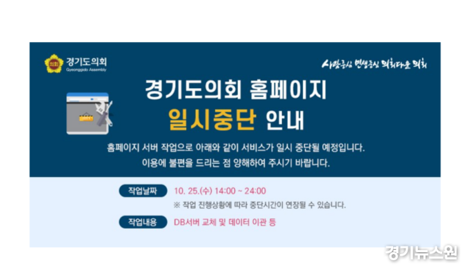 경기도의회가 홈페이지 서버 작업으로 서비스가 일시 중단된다.
