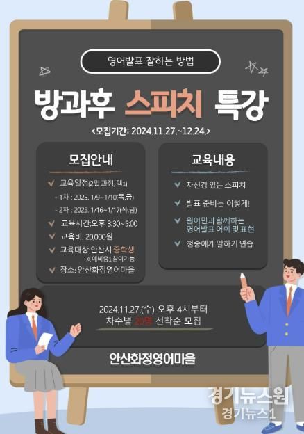 경기뉴스원(경기뉴스1) | 안산시는 안산화정영어마을에서 관내 중학생(예비 중1 포함)을 대상으로 새해맞이 ‘방과후 스피치 특강’ 수강생을 모집한다고 29일 밝혔다.