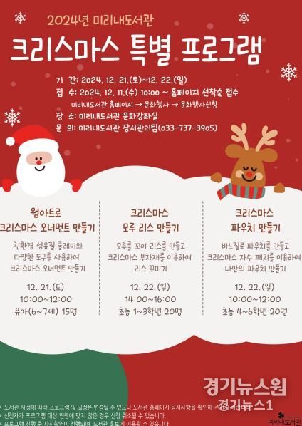 경기뉴스원(경기뉴스1) | 원주시 미리내도서관은 크리스마스를 맞이해 오는 21일과 22일 유아와 어린이를 대상으로 크리스마스 특별 프로그램을 운영한다.