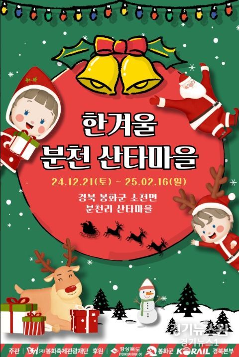 경기뉴스원(경기뉴스1) | (재)봉화축제관광재단이 주최·주관하고 경상북도, 봉화군, 코레일 경북본부가 후원하는 봉화의 대표 겨울 축제 ‘2024-2025 한겨울 분천산타마을’이 오는 12월 21일부터 2025년 2월 16일까지 58일간 봉화군 소천면 분천산타마을 일원에서 운영된다.