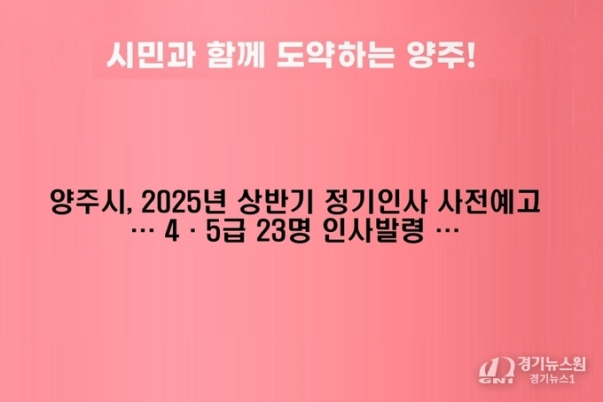 경기뉴스원(경기뉴스1) | 양주시는 26일 2025년 상반기 정기인사에서 4·5급 23명의 인사발령을 사전예고했다.
