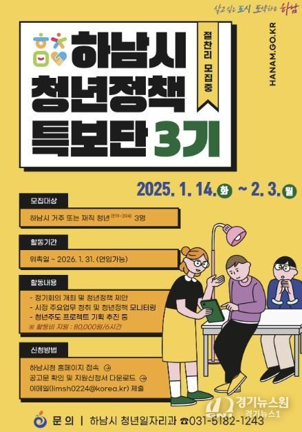 경기뉴스원(경기뉴스1) | 하남시는 시와 청년 간 가교 역할을 수행하는 ‘제3기 청년정책특보단’을 다음달 3일까지 모집한다고 14일 밝혔다.