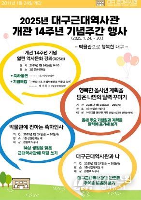 경기뉴스원(경기뉴스1) | (재)대구문화예술진흥원 박물관운영본부 소속 대구근대역사관은 2025년 개관 14주년을 맞아 1월 24일부터 30일까지 축하공연, 기념특강, 체험프로그램 등을 진행하는 기념주간 행사를 개최한다.