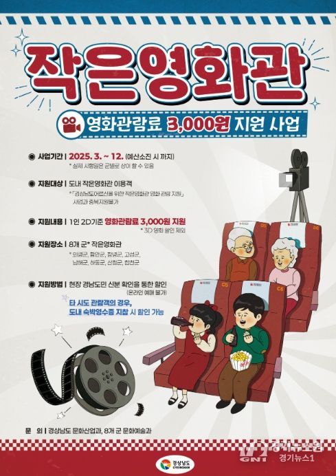 경기뉴스원(경기뉴스1) | 경남도는 도민의 문화생활 향유 기회를 확대하고, 최근 대형 온라인동영상서비스(OTT) 위주의 영상산업 재편으로 어려움을 겪고 있는 영화산업과 작은 영화관을 활성화하고자 ‘작은 영화관 영화관람료 지원사업’을 올해 시범사업으로 추진한다.