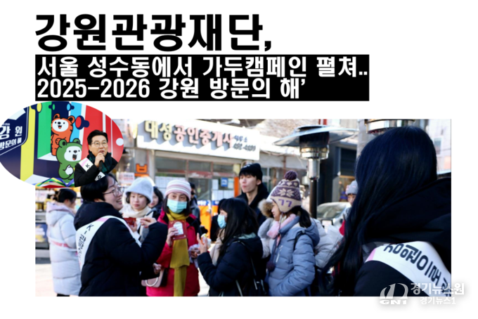 경기뉴스원(경기뉴스1) | 강원특별자치도(도지사 김진태)와 강원관광재단(대표이사 최성현)은 서울 성수동에서 ‘2025-2026 강원 방문의 해’를 알리고, 강원 관광두레의 가치를 홍보하는 가두캠페인과 팝업스토어를 성황리에 개최했다. 이번 캠페인은 강원도의 관광 자원과 주민 주도형 관광 사업체를 서울 시민들에게 효과적으로 소개하고, 강원도의 매력을 널리 알리기 위한 중요한 기회로 마련되었다.
