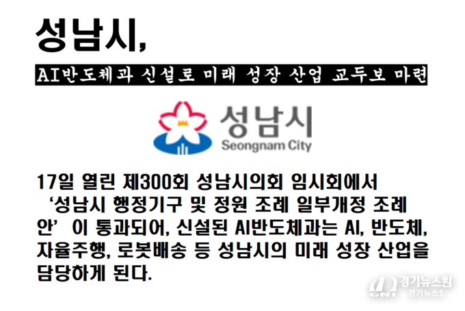 17일 열린 제300회 성남시의회 임시회에서 ‘성남시 행정기구 및 정원 조례 일부개정 조례안’이 통과되어, 신설된 AI반도체과는 AI, 반도체, 자율주행, 로봇배송 등 성남시의 미래 성장 산업을 담당하게 된다.