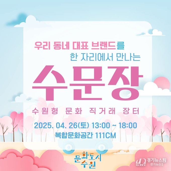 수원문화재단 문화도시센터는 지역 문화 브랜드를 소개하고 지역 가치를 확산하는 대표 문화직거래장터 <수문장>을 오는 4월 26일(토) 오후 1시부터 6시까지 복합문화공간 111CM 마당에서 개최한다고 밝혔다.