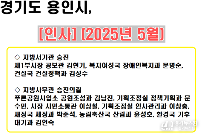 경기뉴스원(경기뉴스1) | 경기도 용인시는 2025년 5월 1일자로 일부 공무원의 승진 및 승진의결 인사를 발표했다.