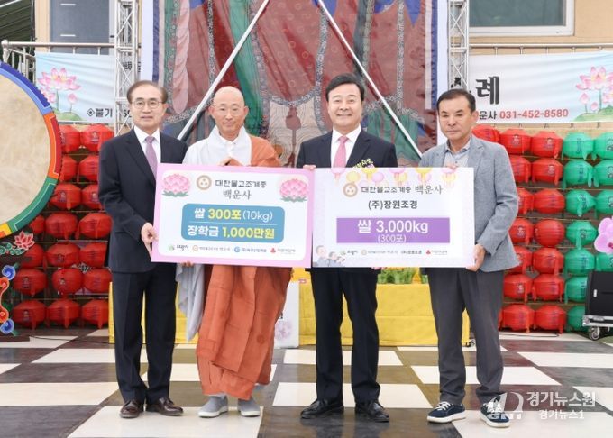 경기뉴스원(경기뉴스1) | 의왕시는 지난 5일, 자비나눔실천도량 대한불교조계종 의왕시 백운사가 부처님 오신 날을 맞아 장학금 1,000만원과 쌀 600포를 기탁했다고 밝혔다.