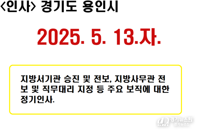 경기도 용인시가 2025년 5월 13일 자로 정기 인사를 단행했다. 이번 인사에서는 지방서기관 승진 및 전보, 지방사무관 전보 및 직무대리 지정 등 주요 보직에 대한 인사가 포함됐다.