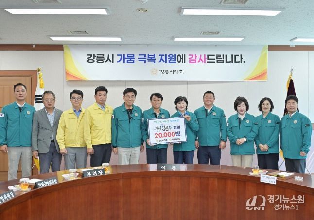 [경기뉴스원/경기뉴스1] | 경산시의회에서 박미옥 산업건설위원장 등이 5일 강릉시의회를 방문, 강릉시 가뭄 위기 극복을 위해 330㎖ 생수 2만 병을 기탁했다