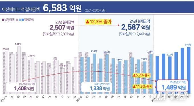 ‘아산페이(모바일·카드) 발행 운영 분석 보고서’에 따르면, 2023년 1월부터 2025년 6월까지 총 누적 결제액은 6,583억 원을 기록했다.