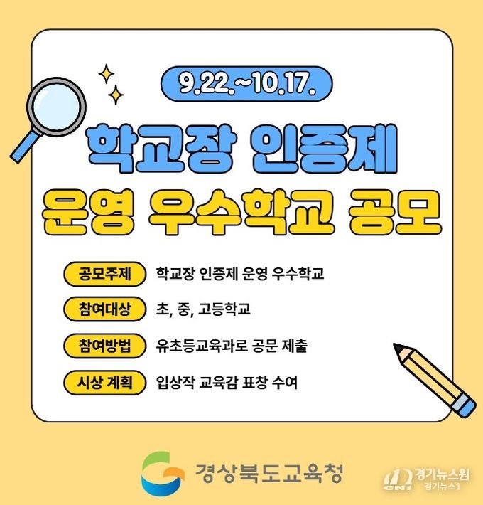 [경기뉴스원/경기뉴스1] | 경북교육청은 학생 스스로 도전 과제를 선택하여 도전하고 실천하는 꿈 성취 인증제의 확산을 위해 제1회 도전! 꿈 성취 학교장 인증제 우수학교를 공모전을 개최한다고 8일 밝혔다.