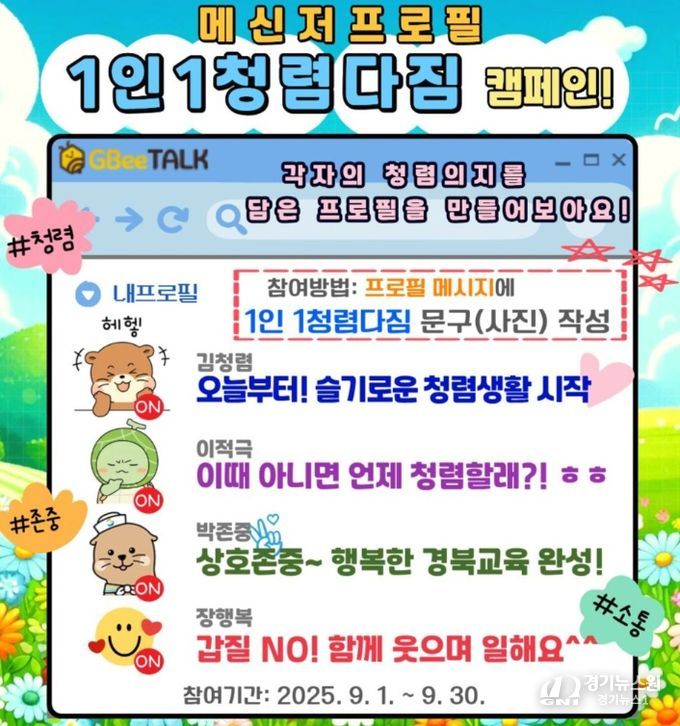 [경기뉴스원/경기뉴스1] | 경북교육청은 9월 한달 간 쉽고 즐겁게 참여할 수 있는 ‘메신저 프로필 '1인·1청렴다짐' 캠페인’을 실시한다고 8일 밝혔다.