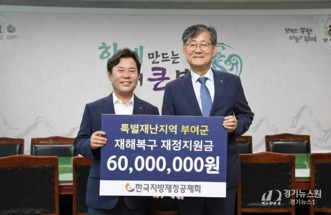 [경기뉴스원/경기뉴스1] | 부여군은 지난 5일 지방재정공제회로부터 특별재난지역 재정지원금 6,000만 원을 전달받았다. 이번 지원금은 8월 6일 특별재난지역으로 지정된 부여군의 피해 복구와 주민 지원을 위해 사용될 예정이다.