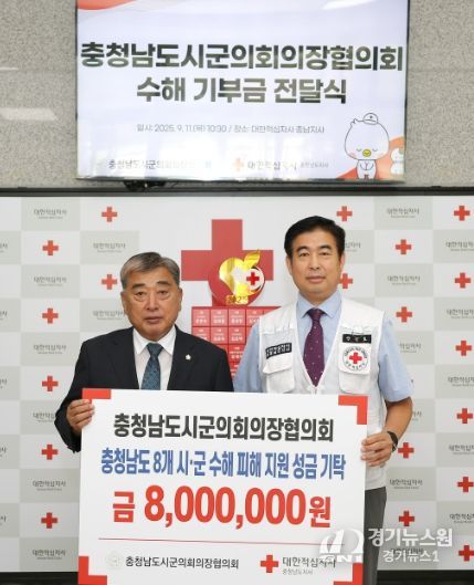 [경기뉴스원/경기뉴스1] | 충남시군의회의장협의회(회장 김경제 서천군의회 의장)는 11일 대한적십자사 충남지사에 방문하여 지난 7월 집중호우로 특별재난지역에 추가 지정된 8개 시군(천안, 공주, 아산, 당진, 부여, 청양, 홍성, 서천)에 대해 총 800만 원의 성금을 기탁했다.