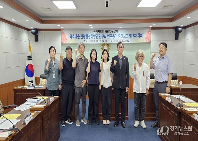 [경기뉴스원/경기뉴스1] | 동해시의회 의원연구단체 '묵호마을 관광활성화방안 연구회'에서 동해시 묵호마을의 지역관광 활성화를 위한, 연구용역 중간보고 및 3차 회의를 12일 동해시의회 2층 소회의실에서 개최하여 지역관광 발전을 위한 구체적인 방안을 모색하는 시간을 가졌다. 이번 회의에는 정동수 대표의원, 이형재 자문위원, 관련부서 팀장 등 9명이 참석하여 연구용역 중간보고를 청취하고 이에 대해 논의했다.