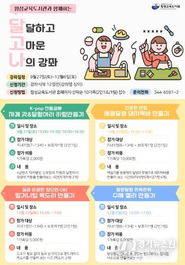 [경기뉴스원/경기뉴스1] | 횡성교육도서관은 9월 27일, 10월 25일, 11월 22일, 12월 6일 4회에 걸쳐 가족과 함께하는 하반기 ‘달달하고 고마운 나의’ 강좌를 운영한다.