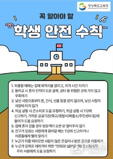 이에 경북교육청은 지난 11일 도내 전 학교에 납치·유괴 사례와 예방을 위한 가정통신문과 학생·학부모 안전 수칙 카드뉴스를 선제적으로 배포했다.