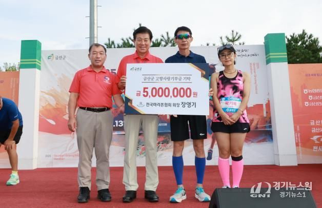 [경기뉴스원/경기뉴스1] | 장영기 전국마라톤협회장은 지난 14일 금산세계인삼축제 투데이 마라톤대회 개최를 기념해 금산군 발전을 위한 고향사랑기부금 500만 원을 쾌척했다.