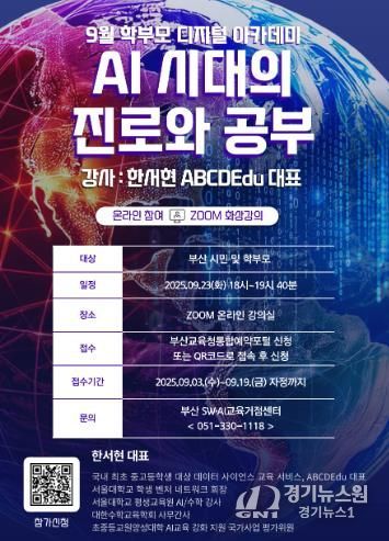 [경기뉴스원/경기뉴스1] | 부산광역시교육청교육연구정보원 SW‧AI교육거점센터는 오는 23일 오후 6시 온라인 원격 연수를 통해 관내 학부모를 대상으로 ‘9월 학부모 디지털 아카데미’를 실시한다.