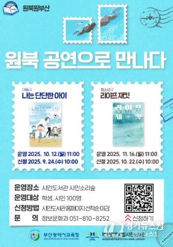 [경기뉴스원/경기뉴스1] | 부산광역시립시민도서관은 오는 10월 12일과 11월 16일 오전 11시에 시민도서관 시민소리숲에서 어린이와 청소년 100명을 대상으로 ‘원북 공연으로 만나다’ 공연을 펼친다.