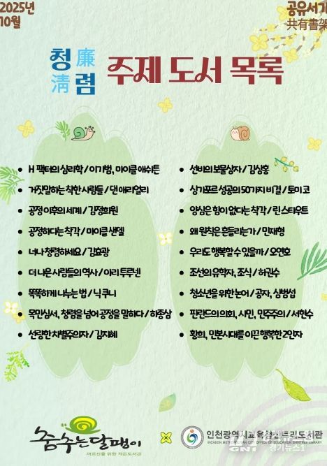 [경기뉴스원/경기뉴스1] | 인천광역시교육청 신트리도서관은 10월 1일부터 31일까지 부평구 작은도서관 ‘춤추는달팽이도서관’과 함께 청렴을 주제로 공유서가를 운영한다.