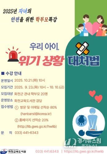 [경기뉴스원/경기뉴스1] | 화천교육도서관은 10월 21일 10시, 화천군 관내 학부모를 대상으로 학부모 소통(疏通) 프로그램 ‘우리 아이, 위기 상황 대처’ 특강을 운영한다.