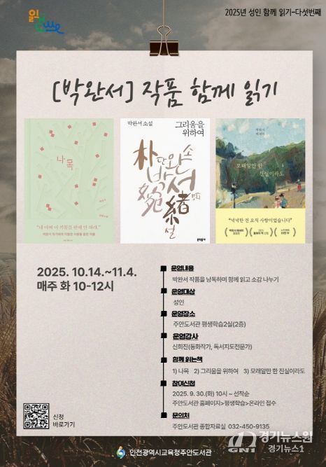 [경기뉴스원/경기뉴스1] | 인천광역시교육청주안도서관은 10월 14일부터 11월 4일까지 운영하는 ‘2025년 성인 함께 읽기-'박완서 작품 함께 읽기'’ 프로그램 참여자를 모집한다.