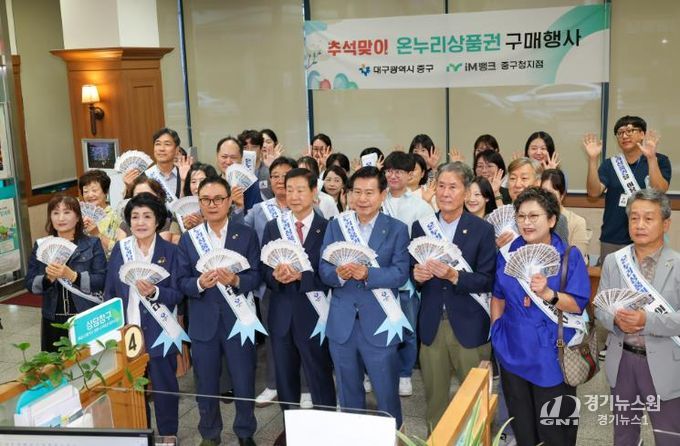 [경기뉴스원/경기뉴스1] | 대구 중구는 추석 명절을 앞둔 24일 아이엠뱅크(구 대구은행) 중구청 지점에서 전통시장 상인회장, 각급 협의단체장, 구의원 등이 함께 침체한 전통시장 활성화를 위한 ‘추석 맞이 온누리상품권 구매 행사’를 개최했다.