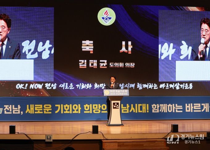 [경기뉴스원/경기뉴스1] | 김태균 전남도의장은 9월 25일 전남도청 김대중강당에서 개최된 ‘2025 바르게살기운동 전남회원대회’에 참석하여 아름다운 전남만들기를 위해 노력해 온 유공회원에게 표창을 수여하고 축사와 함께 격려했다.