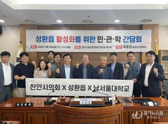 [경기뉴스원/경기뉴스1] | 천안시의회 육종영 행정보건위원장은 26일 ‘성환읍 활성화를 위한 민·관·학 간담회’를 주재하고, 성환 도시재생혁신지구 지정 이후의 현황과 발전 전략을 공유하는 한편 지역대학 연계 사업과 민·관·학 거버넌스 강화 방안을 논의했다.