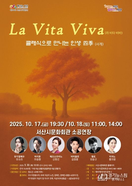 [경기뉴스원/경기뉴스1] | 충남 서산시는 10월 문화회관의 기획공연으로 클래식 콘서트 ‘La Vita Viva(라 비타 비바): 클래식으로 만나는 인생 사계(四季)’를 마련했다고 29일 밝혔다.