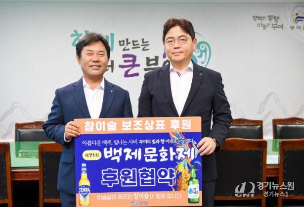 [경기뉴스원/경기뉴스1] | 부여군은 지난 9월 26일 군수실에서 제71회 백제문화제 보조 상표 후원식을 열고, 국내 대표 주류기업인 하이트진로(주)와 함께 축제 성공을 위한 상생 협력의 자리를 가졌다.