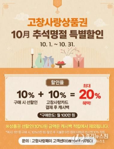 [경기뉴스원/경기뉴스1] | 고창군이 추석을 맞아 군민 생활안정과 지역경제 활성화를 위해 ‘고창사랑상품권 특별할인 행사’를 진행한다. 이번 행사는 10월 한 달간 진행된다.