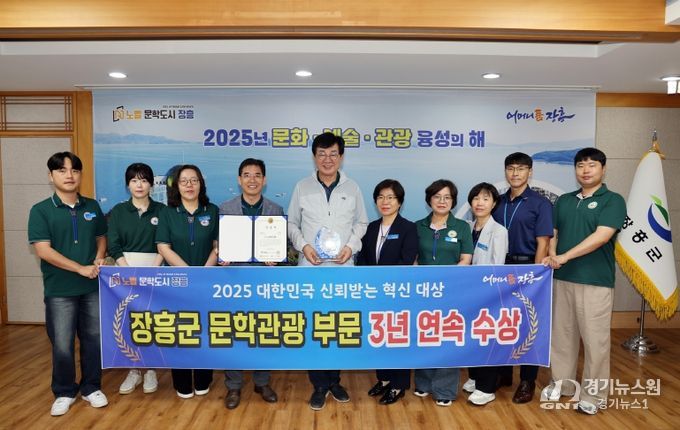 [경기뉴스원/경기뉴스1] | 장흥군이 9월 29일 개최한 ‘2025 대한민국 신뢰받는 혁신대상’시상식에서 문학관광 부문 공공혁신 대상을 수상했다고 밝혔다.