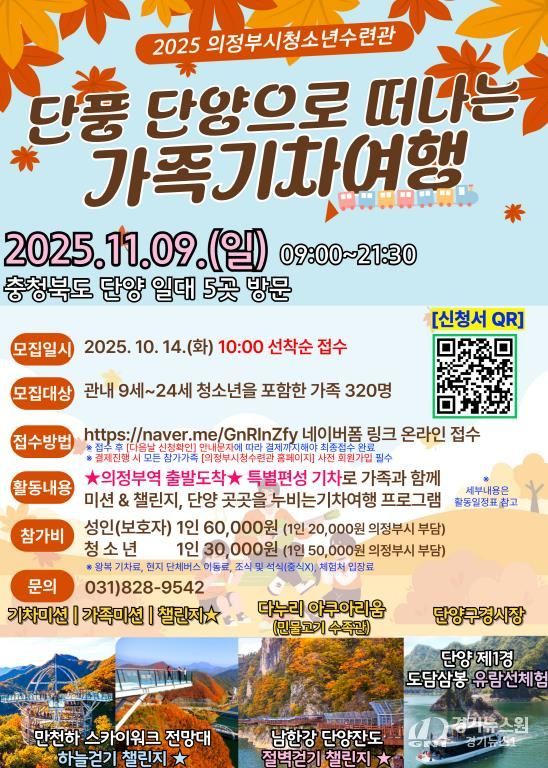 이번 행사는 단풍철 성수기를 맞아 의정부역에서 단양역까지 왕복 특별 기차편을 마련했으며, 도담삼봉·단양잔도·만천하 스카이워크 전망대·다누리 아쿠아리움·구경시장 등 단양의 대표 명소를 탐방한다. 참가 가족은 두 팀으로 나뉘어 순환형 일정으로 운영되며, 현장에서 미션 · 챌린지 활동이 함께 진행되어 여행의 재미를 더할 예정이다.