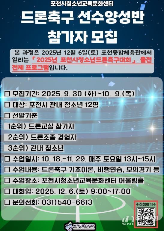 [경기뉴스원/경기뉴스1] | 포천시청소년재단 포천시청소년교육문화센터는 오는 10월 18일부터 11월 29일까지 매주 토요일, ‘드론축구 선수양성반’을 운영한다.