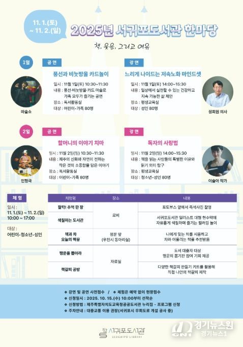 [경기뉴스원/경기뉴스1] | 제주도교육청 서귀포도서관은 11월 1일과 2일 양일간 지역 주민이 함께 즐기는 독서문화 축제 ‘2025년 서귀포도서관 한마당’을 개최한다.
